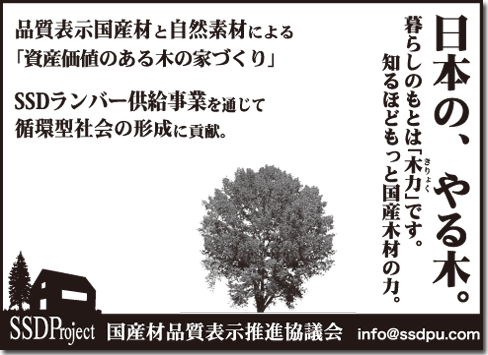 SSDプロジェクトでは、これまでの国産材供給のノウハウを活かし、一昨年の台風で壊滅的被害を被った奈良県十津川村の林業復興を支援する活動を開始いたします。今回は趣旨に賛同する建築家による「家づくりセミナーと住宅相談会」を開催し、参加建築家のパネルと模型による作品展も同時開催します。木材利用ポイントや地域型住宅ブランド化事業の説明コーナーも設けています。参加は無料です。お気軽にお越し下さい。