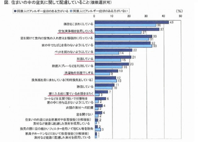 住まいの空気質で配慮していることについて挙げてもらうと、「掃除をこまめにしている」がアレルギー症状の有無に関わらずトップに。アレルギー症状のある人がいる世帯では、「空気清浄機を使用している」(37%)、「窓を開けて室内の空気の入れ替えを積極的に行っている」(33%)、「家の中でたばこを吸わない」(32%)と続いた。このほか「ペットを飼わない」「加湿している」「洗濯物を部屋干しする」といった工夫をしていた。ただし、「内装に自然素材や吸着機能がある素材など健康に配慮した素材を採用している」は2%にとどまった。