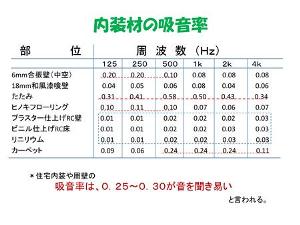 次は、聴覚に関してですが、声の響き方について、説明します。 この波は何を示しているかというと、ここで表紙にトンと打つと、その音が、何秒間残っているかというのを調べ、和室では0.1秒でほとんどなくなってしまいます。この鉄筋コンクリートの住宅では、いつまでも音が反射しています。ずっと残響しているということです。これはどういう事かと言うと、二人で会話をすると、相手の言葉と自分の言葉が重なり、二組が話をすると二組の話が重なる、すると何を話しているのかわからなくなり、耳が常に刺激を受けているので非常にいらつく、という現象が起きます。 |